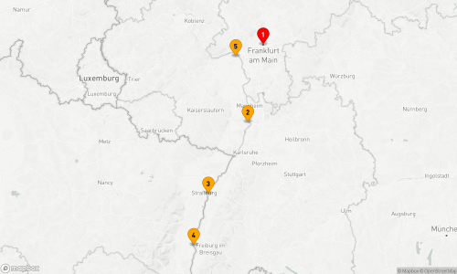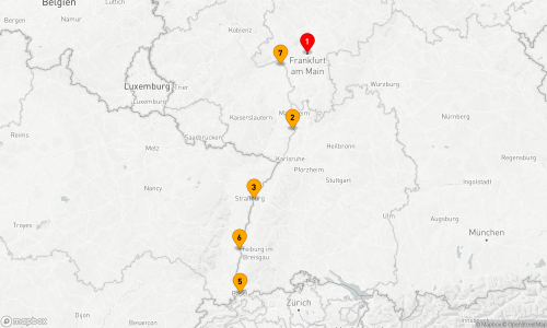 - Route: Frankfurt am Main - Speyer - Straßburg (2 Tage) - Basel - Breisach am Rhein - Mainz - Frankfurt am Main (2 Tage)