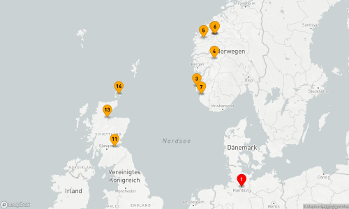 - Route: Hamburg - Seetag - Haugesund - Flåm - Nordfjordeid - Hellesylt - Geirangerfjord - Geiranger - Stavanger - Seetag - Hamburg - Seetag - South Queensferry (2 Tage) - Invergordon - Kirkwall - Seetag - Hamburg