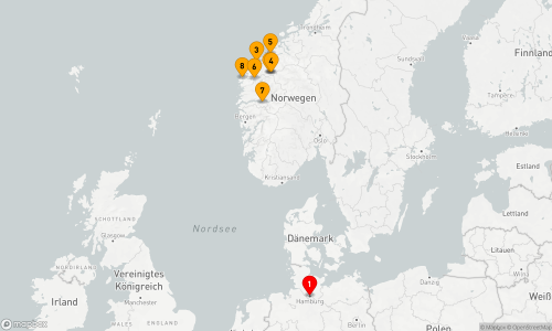 - Route: Hamburg - Seetag - Ålesund - Hellesylt - Geirangerfjord - Geiranger - Molde - Nordfjordeid - Vikøyri - Måløy - Seetag - Hamburg