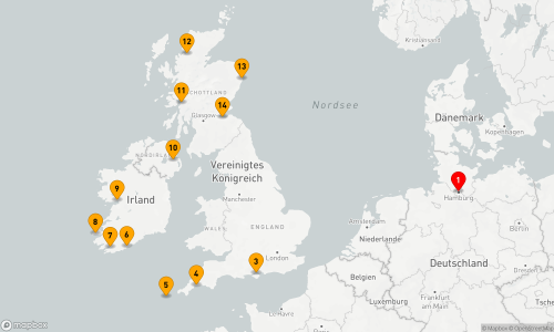 - Route: Hamburg - Seetag - Cowes - Fowey - Isles of Scilly - Kinsale - Bantry - Dingle - Galway - Belfast - Oban - Ullapool - Aberdeen - Edinburg / Leith (2 Tage) - Seetag - Hamburg