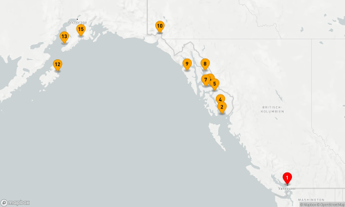 - Route: Vancouver - Inside Passage - Ketchikan - Wrangell - Petersburg - Kupreanof Island - Tracy Arm - Chichagof Island - Hubbard-Gletscher - Seetag - Kodiak - Homer - Seetag - Seward