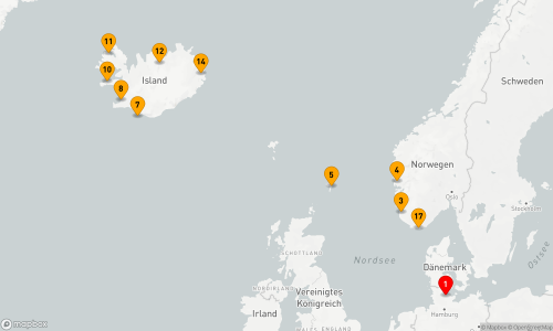 - Route: Kiel - Seetag - Sandnes - Bergen - Lerwick - Seetag - Heimaey - Reykjavík (2 Tage) - Grundarfjörður - Ísafjörður - Akureyri - Seetag - Seyðisfjörður - Seetag (2 Tage) - Mandal - Seetag - Kiel