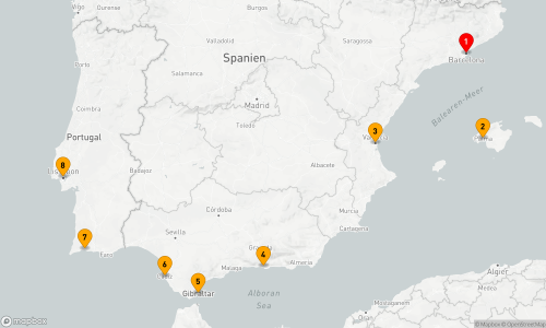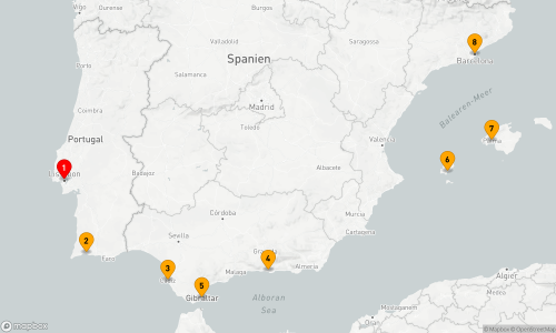 - Route: Barcelona - Palma de Mallorca - Valencia - Motril - Gibraltar - Cádiz - Portimao - Lissabon