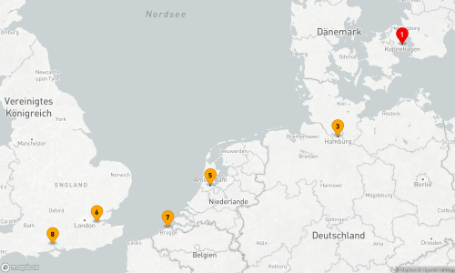 - Route: Kopenhagen - Seetag - Hamburg (2 Tage) - Amsterdam - Tilbury - Zeebrügge - Southampton