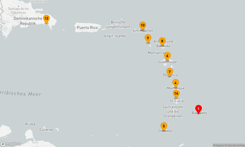 - Route: Bridgetown (2 Tage) - Seetag - Fort-de-France - St. George's - Pointe-à-Pitre - Roseau - Saint John's - Basseterre - Philipsburg - Seetag - La Romana - Seetag - Castries - Bridgetown
