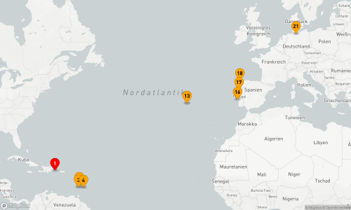 - Route: La Romana - Seetag - Kingstown - VC - Bridgetown (2 Tage) - Castries - Seetag (6 Tage) - Ponta Delgada - Sao Miguel - Seetag (2 Tage) - Lissabon - Leixoes / Porto - La Coruña - Seetag (2 Tage) - Hamburg
